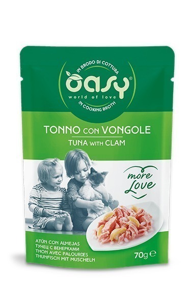 Composizione: tonno 55%, brodo di pesce 37,98%, vongole 5%, riso 1%, aroma naturale (pollo) 1%.